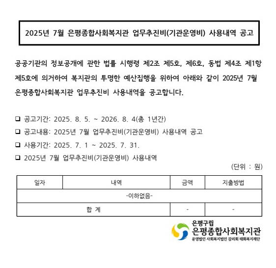 2025년 7월 업무추진비(기관운영비) 사용내역 공고