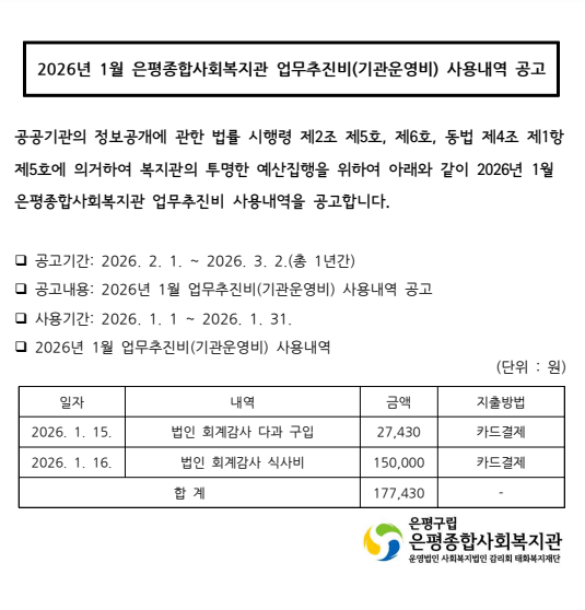 2026년 1월 업무추진비(기관운영비) 사용내역 공고